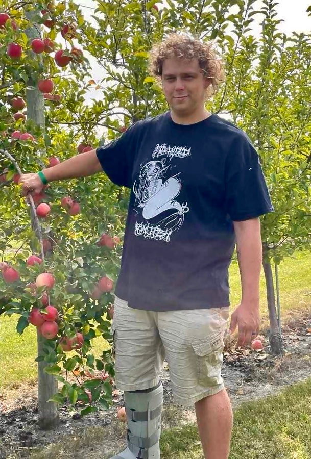 A metalcore styled shirt with a “realistic” version of a mermaid on it, text says polluted fantasy